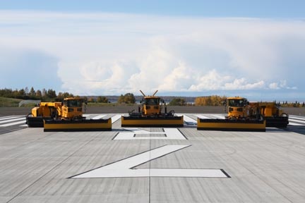 The three Oshkosh HT-Series vehicles are each equipped with a 470 hp engine, a fifth wheel hitch, a 24-foot Oshkosh flared runway plow, and a 22-foot cradling broom. The chassis features ALL STEER® electronic all-wheel steering for enhanced maneuverability. The cab features excellent outward visibility and ergonomic controls, with all primary snow removal functions controlled from a single joystick.